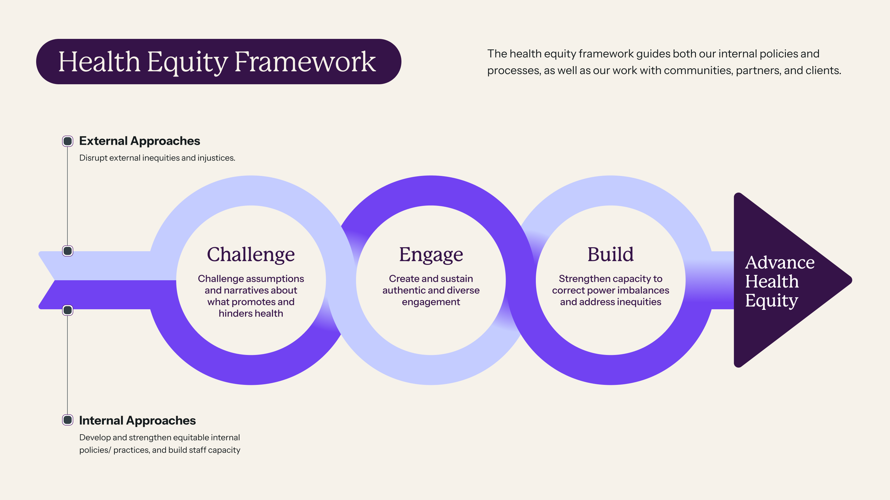 We’ve developed our own health equity framework – centered on racial equity. This framework guides our internal policies and processes, and how we work with communities, partners, and clients.